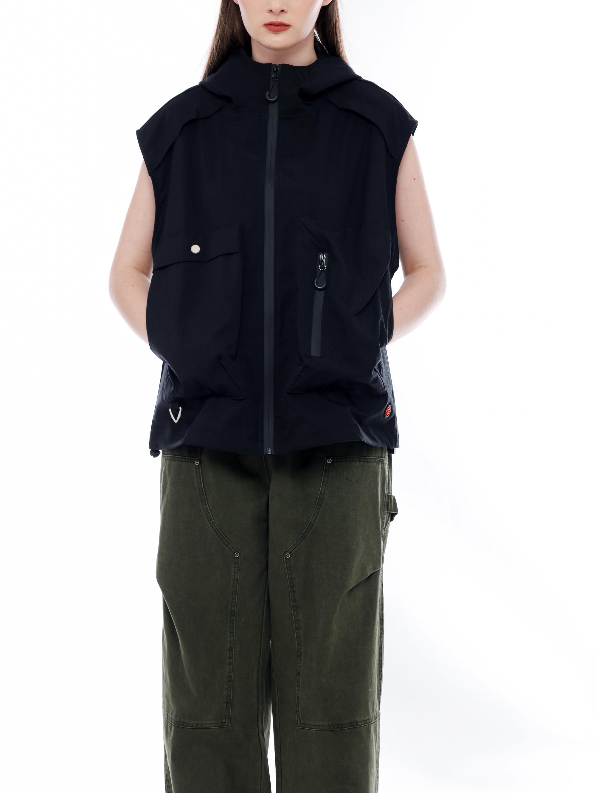 VEST WITH COLLAR HOOD ZIPPER UP WATER REPELLENT POCKET FLAP AND POCKET WITH ZIPPER